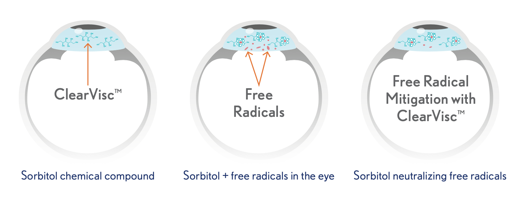 ClearVisc is the only dispersive OVD in the United States that contains sorbitol, which has antioxidant or free radical scavenging properties that can protect tissues in the eye. The sorbitol neutralizes free radicals by donating an electron to the free radical.